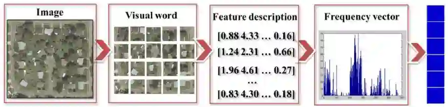 要使用主题模型,必须想办法用词袋模型表征待分析对象。在图像应用中,假设一张图像对应一篇文章,原来连续的一些特征对应的就是文章中的词。预处理过程和刚才的词袋模型表示过程一样,先进行特征提取,然后形成一个字典,根据字典统计出直方图。在遥感图像中,如果我们把一级影像看成一个餐馆的话,数据量太大。那么就要进行语义分割问题,我们需要把图像切成小的图像,然后将小的图象当成一篇文章,或者上文提到的一个餐馆: