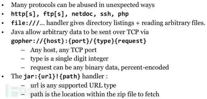 现在的目标是访问服务器的内部本地文件/资源(文件泄露),利用支持各种URL方案/协议的许多平台/解析器中使用的协议处理程序(封装):