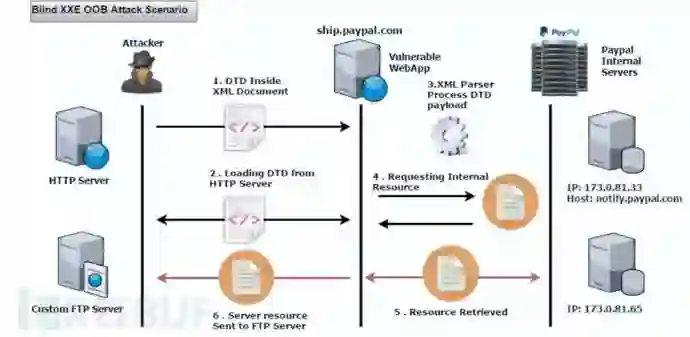 应用程序如果存在解析XML的功能可能会存在XML外部实体注入漏洞,当输入包含对外部实体引用的XML而由不安全配置的XML解析器处理时,会造成漏洞。它会导致机密数据泄露,拒绝服务,服务器端请求伪造风险,以及进行内网端口扫描等其他系统影响。PayPal官方网络应用程序(PayPal Inc – PayPal Multi-Order Shipping Application [Core])则存在此安全漏洞。