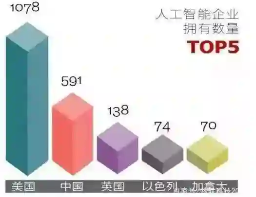截至2017年6月,全球人工智能初创企业共计2617家。美国占据1078家居首,中国以592家企业排名第二,其后分别是英国,以色列,加拿大等国家。
