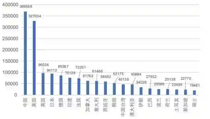 中国已经成为全球人工智能专利授权最多的国家,数量略微领先于美国和日本,而中美日三国占全球总体专利公开数量的74%。