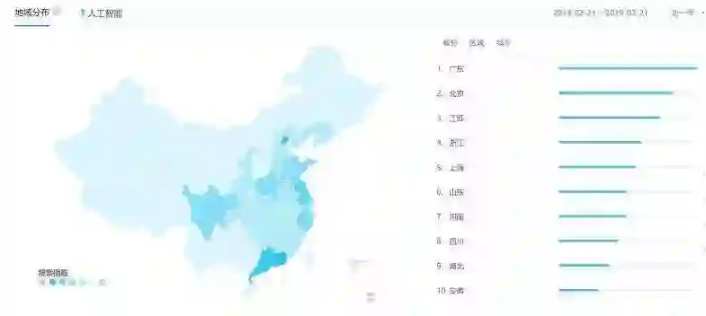 在搜索关注人工智能的人群中,百度指数显示绝大部分来源于广东、北京、上海、江苏、浙江等发达东部沿海地区省市。