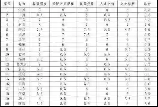 综合以上分析,从政策强度、预期产业规模、政策投资、人才支持、企业扶持五个能够量化的维度,来综合分析未来人工智能发展与投资的热点区域。