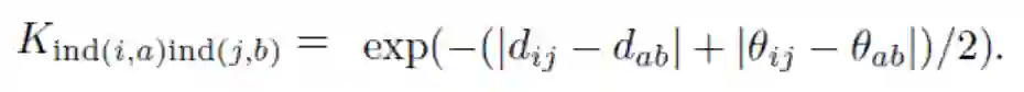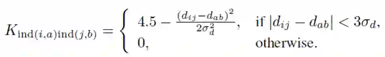 我们使用Hessian检测器[13]提取兴趣点,并使用SIFT描述符[12]表示节点属性。通过节点的外观相似度来计算节点相似度。我们使用Delaunay三角剖分来构建图形边缘,并将每条边(i, j)与两个特征d~ij~和 关联,其中d~ij~是节点v~i~和v~j~之间的欧氏距离,而 是边(i,j) 与水平线之间的绝对角度,即 。随后,计算 中的边(i,j)和 中的边(a,b)之间的边亲和度为