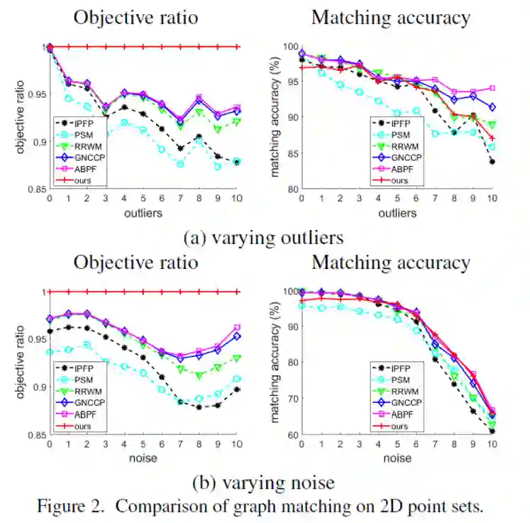 为了在更现实的场景中评估算法,我们遵循**[9]中的实验协议**生成2D点集,并寻找它们之间的对应关系。对于每个试验,我们构造两个集合 和 ,其中包含 个内部点,然后将 个离群点添加到这两个集合中。在平面的给定区域中随机选择 中的内点。然后,我们对齐添加高斯白噪声 干扰,然后旋转和平移整个点集,从而获得 中的对应内点。每组的离群点是从与内点相同的区域中随机选择。 中点坐标的范围是 。给定两对点 和 ,其边的亲密度计算为