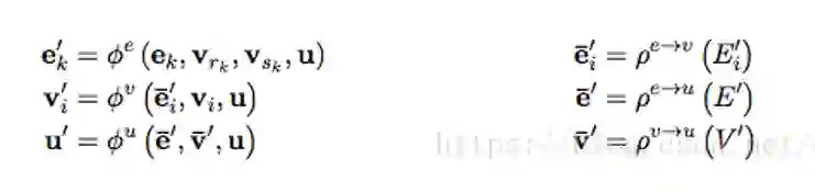 三个聚合函数将输入图的信息从边到节点,最后到全局属性进行聚合;三个更新函数,使用聚合的信息来更新输出图。
