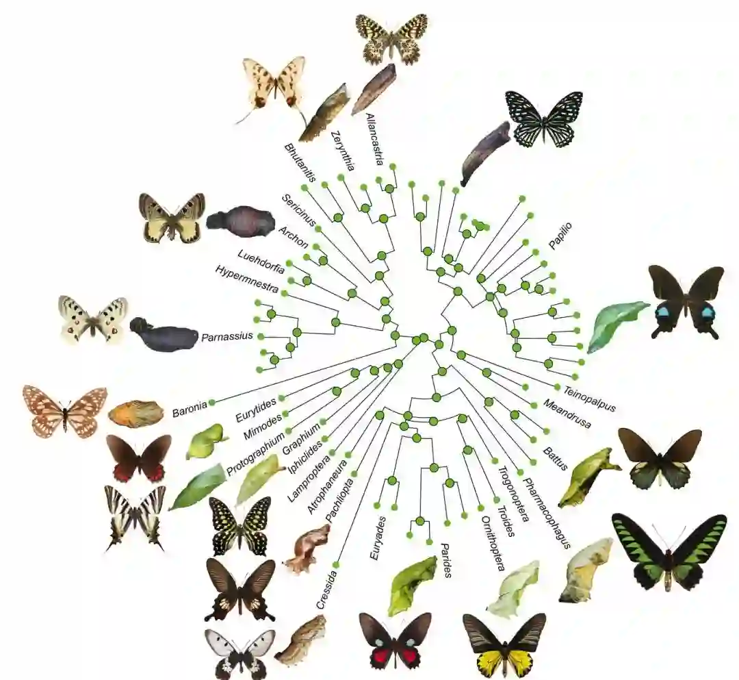 在此,我们要抛出一个有趣的科学问题:在凤蝶进化过程中,每个阶段的进化关系是否是一致的呢?大自然用了什么样的代码和秘密来控制它们的发育和进化?