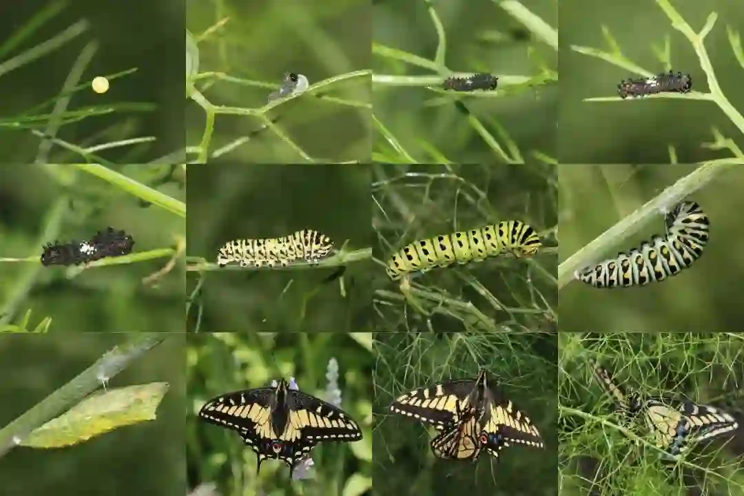 择丽凤蝶 (Papilio zelicaon)的生活史(卵、新生儿、L1, L2, L3, L4, L5世代、预蛹、蛹、雄性成虫、交尾、产卵)