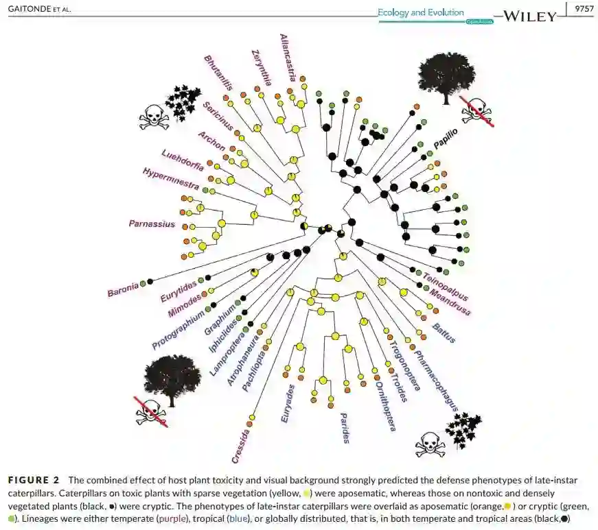 不同末龄毛毛虫防御策略与植物毒性和背景色间的系统关系 (内围点表示食物资源:黄色是有毒稀疏的植物,黑色是浓密无毒的植物)(外围点表示末龄毛虫防御策略:橘红色是警戒色,绿色是隐蔽色,蓝色是伪装)(字体颜色表示植物分布:紫色是温带植物,蓝色是热带植物,黑色是温带和热带均有分布的植物)