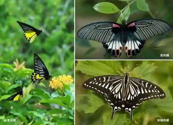 精美无比的凤蝶(左为金裳凤蝶、右上为美凤蝶,右下为柑橘凤蝶)