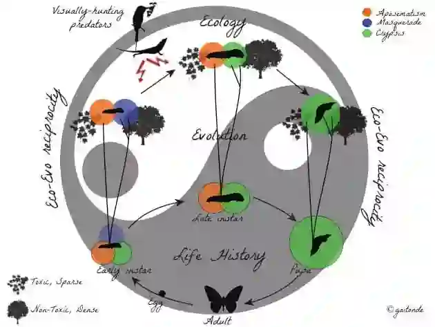 凤蝶生态与进化之间的相互关系就像阴阳系统一样循环(橘红色是警戒色,绿色是隐蔽色,蓝色是伪装)