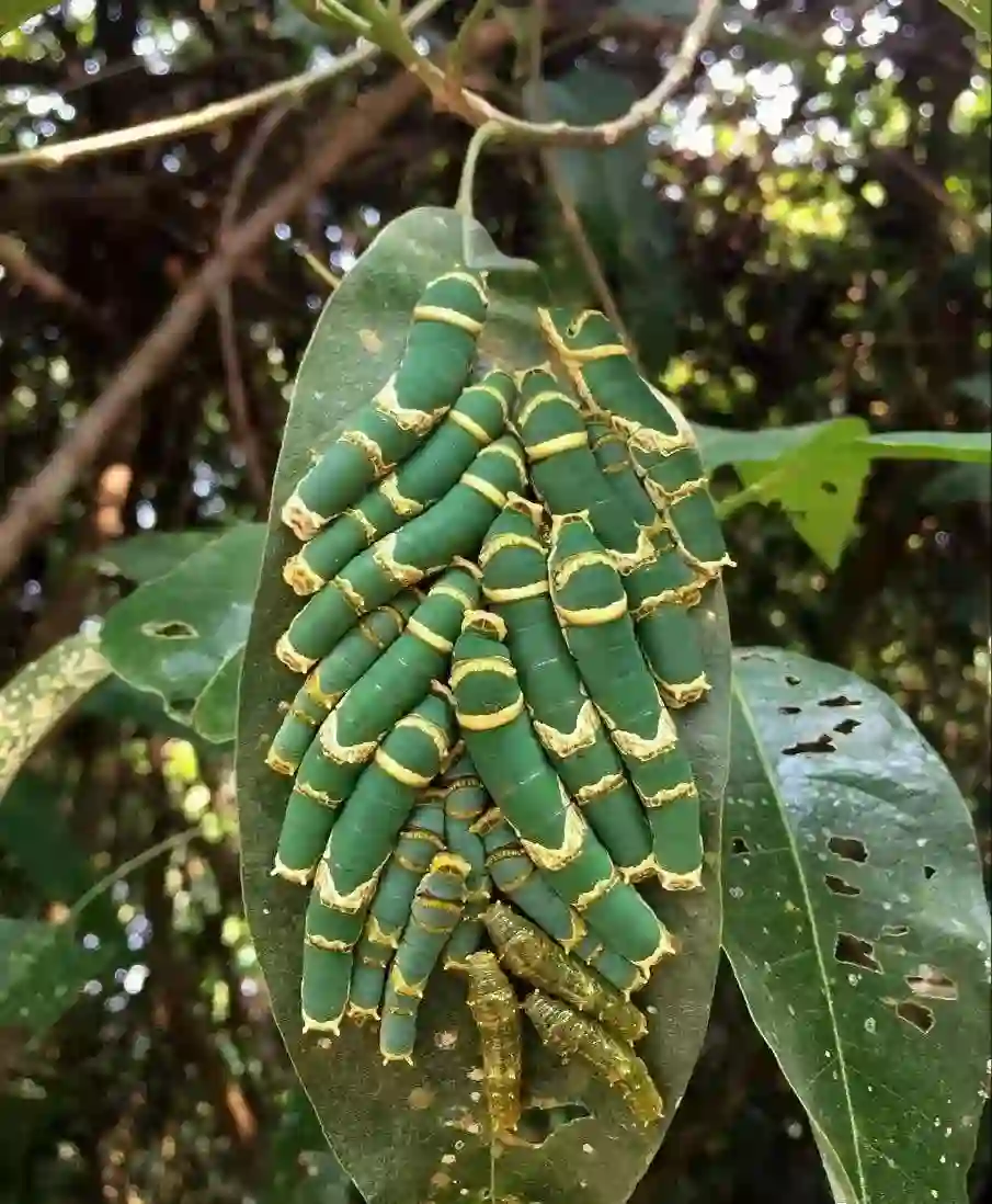 如版纳的纳补凤蝶幼虫 Papilio noblei,群居在叶子正面,看起来相当恐怖(刘景欣摄影)