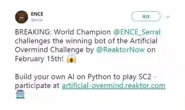 接下来另一场值得期待的"大战",将发生在 2 月 15 日:在星际争霸 2 AI 直播预告公布后,芬兰电竞战队 ENCE 也发布通告,称 WCS 星际争霸 2 全球总冠军芬兰选手 Serral 将在与星际 2 人工智能上演一场人机大战。届时 AI 与人类顶尖选手的对战,或许还将会再次创造新的历史事件。