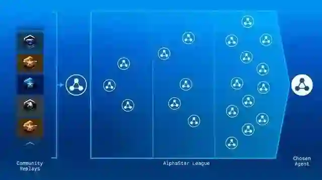 之后,团队会使用一个称为“Alpha League”的方法。在这个方法中,Alpha League 的第一个竞争对手就是从人类数据中训练出来的神经网络,然后进行一次又一次的迭代,产生新的 agent 和分支,用以壮大“Alpha League”。