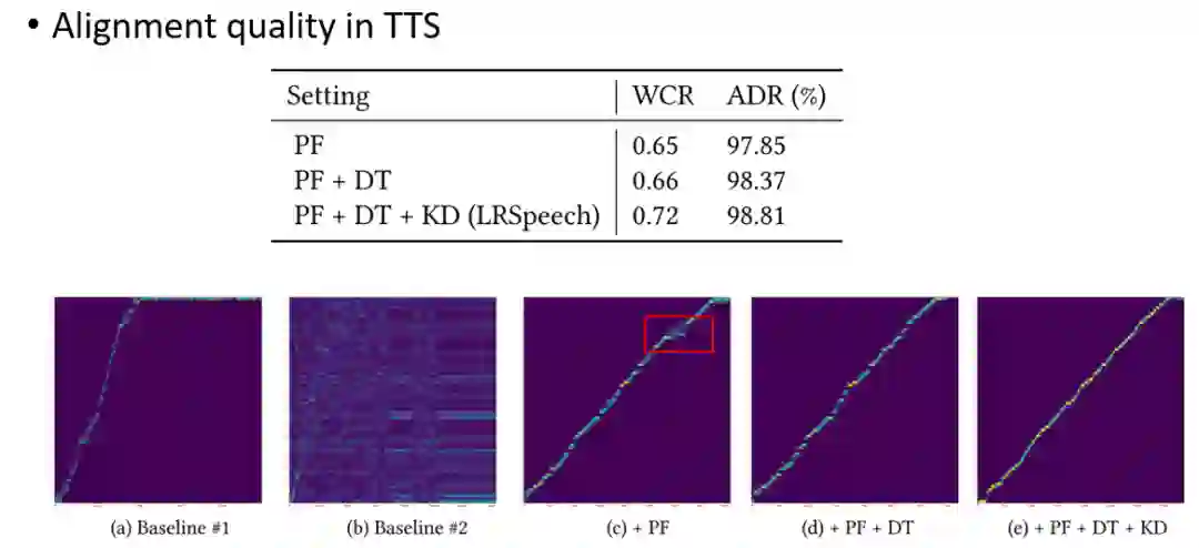 后面是一些更加细致的探究实验。比如,前面提到的 WCR、ADR 指标,每一个模块对指标都有提高吗?我们再回顾一下,WCR 是漏词的比例或者漏词的分数,可以理解为分数越高,这个句子越不容易漏词。ADR 越高,文本和语料对齐越好,这个声音越流畅。