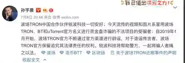 在他后来的公开辟谣中,未在辟谣中直接提到“波场超级社区APP”,也未直接澄清与该项目没有关系。当发现有人借官方名义传销骗钱,未能在第一时间辟谣,直到出事后才站出来,也激发网友热议。