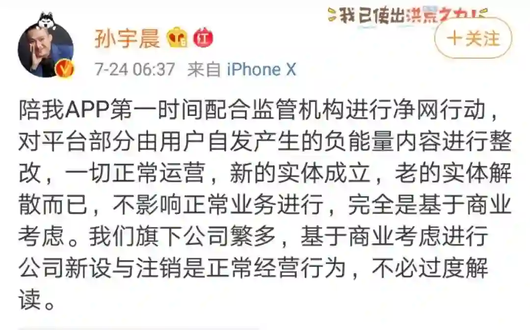 早年公司内部员工透露,孙宇晨的大部分精力都在经营媒体与个人品牌上,公司开发与产品业务进展缓慢。之后,他收购了一家视频直播公司“陪我”。新华社曾报道,“陪我APP”涉嫌色情交易,曾在去年网络音频整治中被下架。