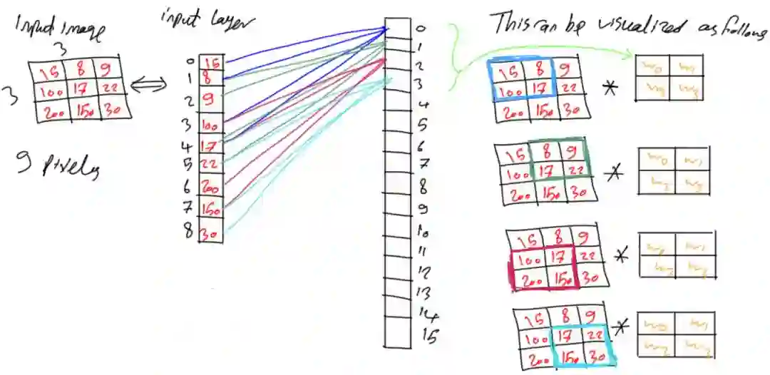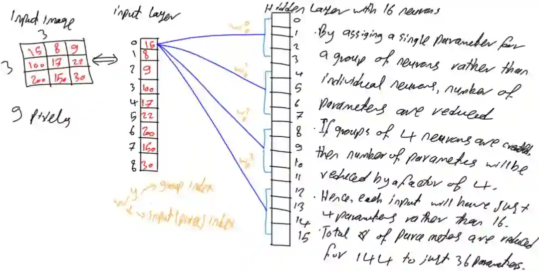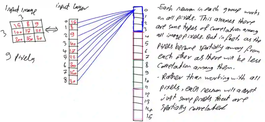 之前所述内容使得每个神经元接受所有像素,若存在接受4个输入的函数f(x1,x2,x3,x4),则这意味着要基于所有这4个输入来进行决定。如果只有2个输入,但其输出结果与使用4个输入的结果相同,那么将不必使用所有的这4个输入,只需给出对结果有影响的2个输入即可。借鉴该思想,每个神经元接受输入的9个像素,若能使用更少的像素获得相同或更好的结果就大大降低了参数数量,因此可以朝着这个方向优化网络参数。