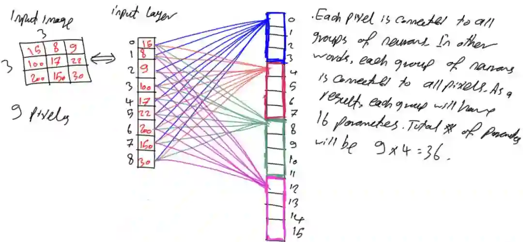 图7显示了每个像素到每个组中第一个神经元的连接,但每组中的每个像素与每个神经元还是相互连接,该网络仍然是全连接网络。