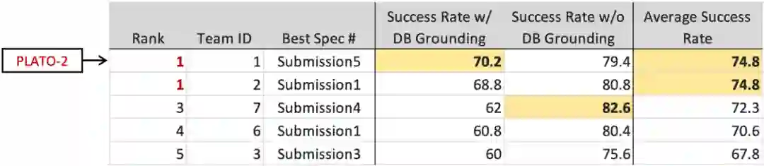 子任务 1 评估中,考虑了宽松和严格 2 种场景下的任务成功率:对于宽松评估(Success Rate w/o DB Grounding),众包人员跟系统交互,然后标注任务是否成功,该过程中不会审核系统的回复是否跟数据库信息冲突;对于严格评估(Success Rate w/ DB Grounding),针对众包人员标注任务成功的对话,会进一步审核系统回复是否跟数据库信息匹配,只有 2 个条件都满足才算任务成功。宽松评估的区分度相对较弱,排名在前几位的方法差距较小;而严格评估则具有较强的区分度,且更能反映真实场景的性能,百度在该指标下排名第一,显著超越了其他系统。最终的榜单为宽松和严格评估的均值,百度和另外一个团队并列第一。