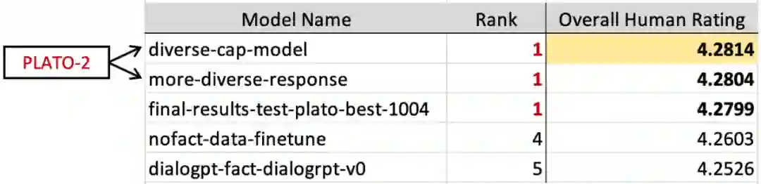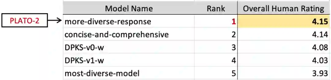 在子任务 2 中,互联网上的真实用户被邀请与机器人进行闲聊,且对话的内容和方向不设限制,以反映真实应用场景下对话系统的效果。收集到的人机交互对话会分发给众包人员进行评估,评估指标包括逻辑一致性、回复多样性、话题深度等 10 个方面,综合考量后给出整体得分。该子任务致力于评估开放域的人机交互效果,而这恰恰是 PLATO-2 的擅长之处。最终结果显示,该榜单前 2 名均被百度包揽,其中百度开源的 PLATO-2 模型排名第一。