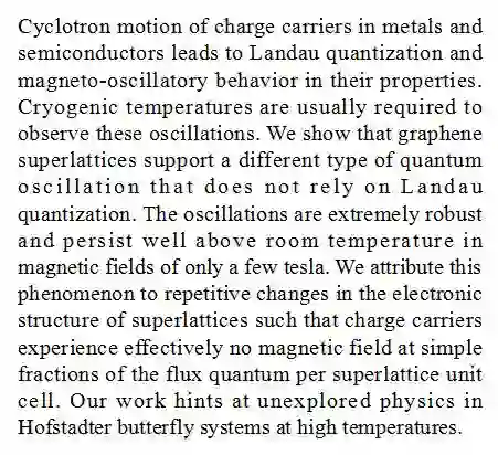 (导读 魏甜甜)金属和半导体中载流子的朗道量子化和磁振荡通常需要在低温下进行观察。本研究在石墨烯超晶格中展示了不依赖朗道量子化的一种量子振荡。这种振荡可以保持在温度高于室温且只有几个特斯拉的磁场中。研究人员把这种现象归因于超晶格电子结构的重复变化。研究结果暗示了高温下霍夫施塔特蝴蝶系统中未探索过的物理现象。