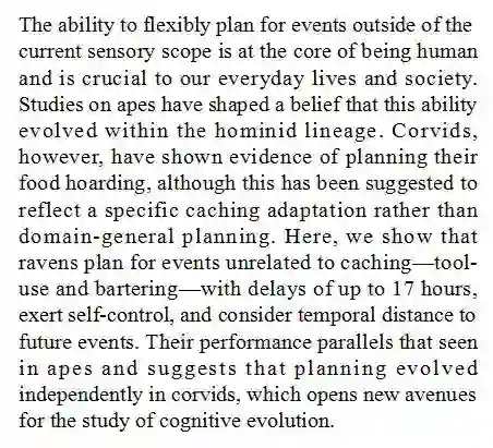 (导读 郭怿暄)对未来超出当前感知范围的事情进行灵活规划是人科动物进化中产生的核心技能之一。本研究发现鸦科鸟类不仅在贮食中表现出计划性,在工具使用、以物易物方面也可对最长 17 小时之后发生的事情表现出普遍的计划能力。这一结果提示计划性在猿类和鸦科是独立、平行进化而来,为研究认知进化翻开崭新的一页。