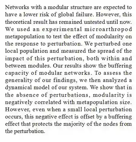 (导读 刘威尔)模块化网络是否具有更低的整体失效风险尚未证实。本文利用微型节肢动物的实验复合种群检验模块化对扰动响应的影响,发现了模块化网络的缓冲作用;动态模型分析显示, 缓冲作用能够抵消模块化对种群大小的负效应,保护大部分模块节点免于扰动影响。
