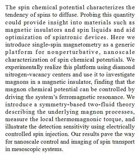 (导读:阿金)自旋化学势可以描述自旋扩散的特征,而对它的深入了解可以帮助优化自旋元件。本研究引入单体自旋磁探测作为实验平台,利用金刚石中氮的空位缺陷研究磁绝缘体中的磁子,发现能够通过诱导系统的铁磁共振来控制磁子的化学势。这些实验结果为在介观体系内自旋输运的纳米尺度控制及其成像提供了实验基础。