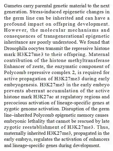 (导读 郭怿暄)父母的遗传和表观遗传信息均可以通过生殖细胞传递给下一代。本研究发现果蝇卵细胞中的 H3K27me3 可以通过母体提供的 zeste 基因增强子(Enhancer of zeste)和 PRC2(Polycomb repressive complex 2)在胚胎发育早期在合子中传递。破坏 PRC2 可造成一些基因增强子出现异常的 H3K27a c聚积,种系特异性基因提前激活,最终导致胚胎死亡。