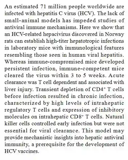 (导读 郭思瑶) 世界上约有 7100 万人感染丙肝病毒(HCV),但却缺乏有效地实验动物模型进行研究。研究人员通过利用在挪威鼠上发现的 HCV 相关病毒在实验小鼠上建立了高滴度肝脏感染,与人类肝炎感染的免疫特征类似。该模型有利于肝内抗病毒机制研究和乙肝病毒疫苗的研发。