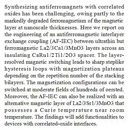 (导读:阿金)基于氧化物的合成反铁磁体的铁磁层在纳米级别厚度上会发生明显的磁性退化。本研究在超薄的磁性界面 La2/3Ca1/3MnO3 和绝缘 CaRu1/2Ti1/2O3 磁片之间发现了清晰的反铁磁层间交换耦合效应(AF-IEC),并观察到了磁层间的分层磁化翻转模式,导致其磁滞回线呈阶梯状。该发现有助于进一步开发相关氧化物电子学元件。