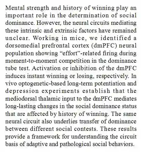 胜负经历重塑丘脑-前额叶皮层环路调节社会竞争优势
