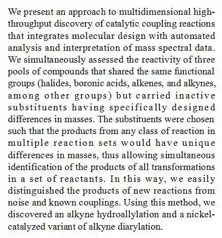 (导读 卓思琪)本文展现了一种整合分子设计、自动化分析以及质谱数据解析的多维高通量筛选技术,用于发现催化偶联反应。通过对反应集非活性基团的设计,该系统可以通过反应前后化合物质量上的差异同时鉴别一个反应集中的所有转化产物,从而使研究者能简单地从众多已知偶联中区分出新反应的产物。