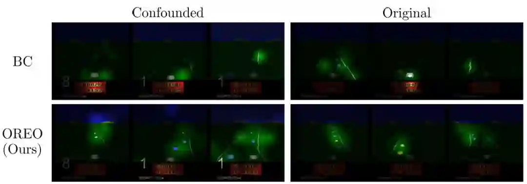 研究员们发现,因果混淆问题在一般的场景中广泛存在。如图7所示,原本环境下学到的策略表现远不如训练时将分数掩盖掉的好。原环境中,策略模型会仅仅依赖于画面中的分数给出动作,因为它与专家动作的关系紧密而敏感,但却不知这只是专家动作的结果,所以在使用中不能采取有效的动作。而在分数被掩盖的环境中,策略模型不得不寻找其他线索来预测专家动作,才得以发现真实规律。