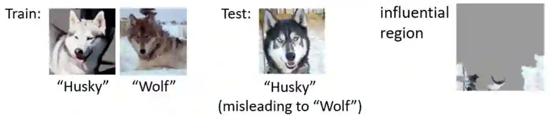 人们已经发现标准的有监督学习方法,特别是深度学习方法对分布外样例的预测表现欠佳。例如图1中的例子[Ribeiro’16],若训练集中大部分“哈士奇”的图片都是暗背景而大部分“狼”的图片都是雪地背景,那对于处在雪地中的“哈士奇”的测试样例,模型会预测为“狼”。若对模型进行可视化可发现模型更关注于背景,因为在这样的数据集上,背景与前景物体具有很强的关联性,并且背景是一个比前景物体更有区分度的特征,但只有前景物体决定图片的标注。