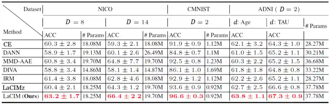 在实验中,研究员们选择了一些最新的领域泛化数据集,包括 NICO 自然图片数据集、彩色 MNIST,以及预测阿尔兹海默症的 ADNI 数据集。表2中的结果表明 LaCIM 取得了最好的表现。可以注意到 LaCIM 也比不区分 s 和 v 的变种 LaCIMz 表现好,说明了将 s 和 v 分别建模的好处。图6中的可视化分析表明,LaCIM 很好地区分开了语义和多样因子,且关注图片中具有语义信息的区域。
