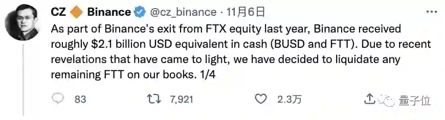 11月6日,赵长鹏突然发推表示:要抛售币安账面上所有FTT代币。