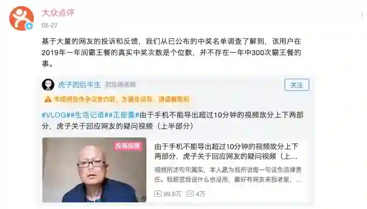 大众点评的 B 站的官方账号回应称,虎子去年的霸王餐中奖次数只有个位数,不可能一年吃 300 次霸王餐。而虎子也悄悄删除了那期回应的视频。