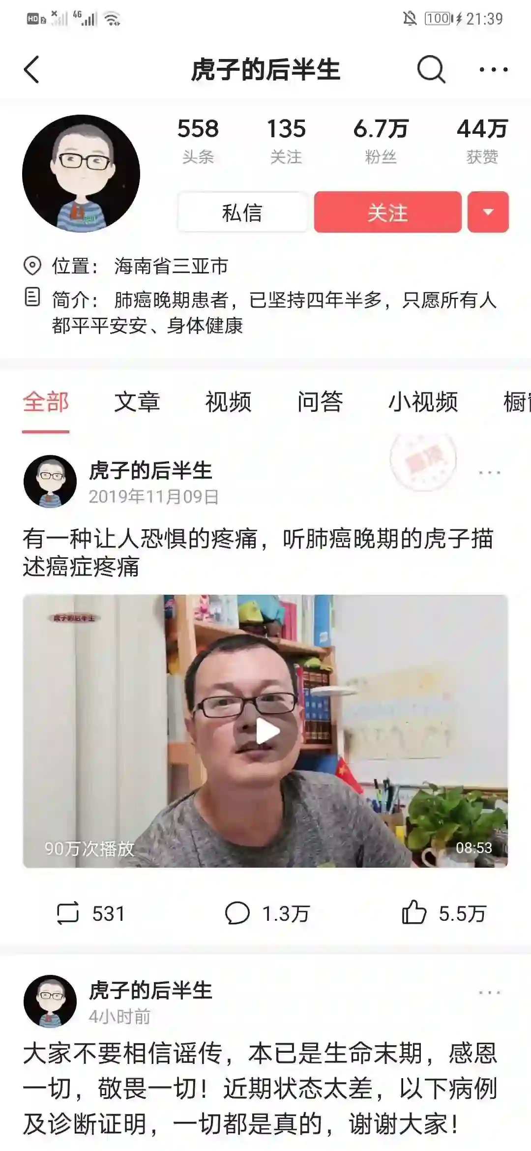 2019年 12 月 10 日,UP 主 @虎子的后半生凭借一条视频在 B 站火了,视频的标题是:《36岁患肺癌崩溃,山穷水尽,母亲照顾百病缠身的父亲突然又中风》。