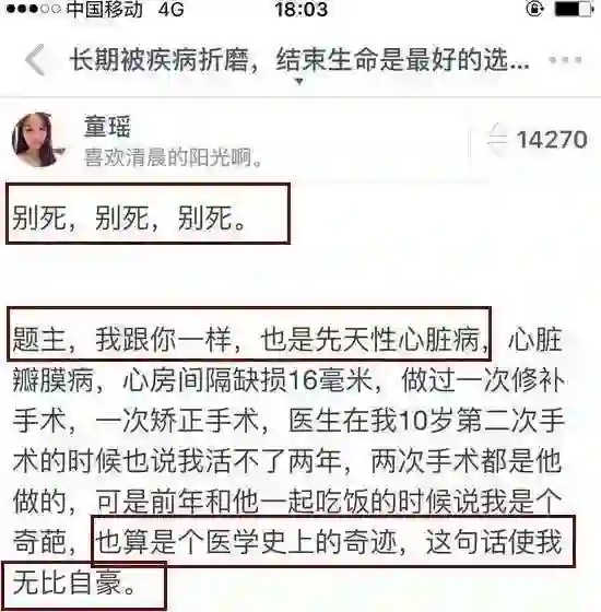 2015 年,就有一位患有先天性心脏病的女大学生,在知乎发了一篇题为《长期被疾病折磨,结束生命是最好的选择吗?》的帖子,表示自己无法忍受病痛折磨,想要放弃治疗。