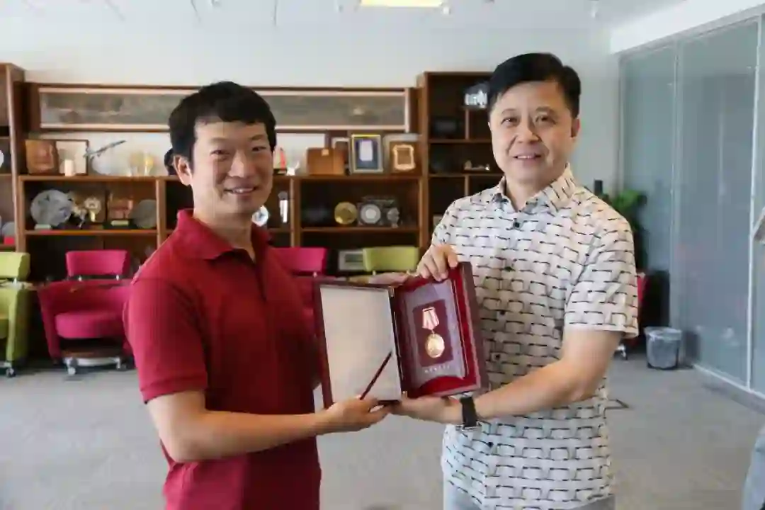 微软亚洲研究院院长洪小文(右)为陈刚(左)颁发首都劳动奖章