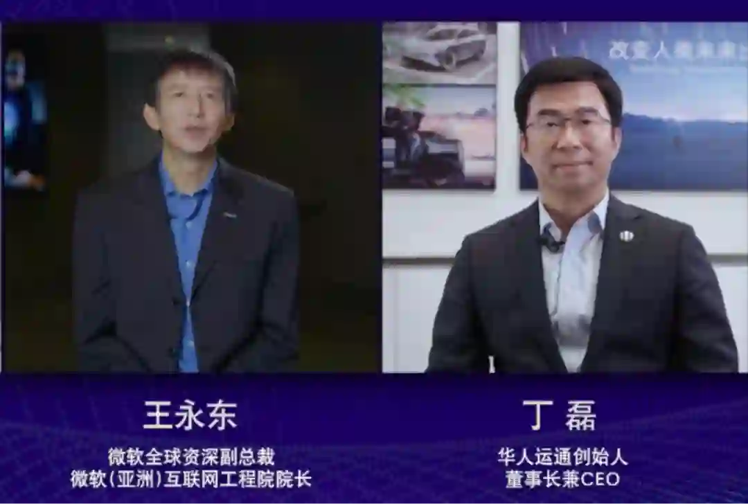 微软全球资深副总裁、微软(亚洲)互联网工程院院长王永东(左)、华人运通创始人、董事长兼 CEO 丁磊(右)