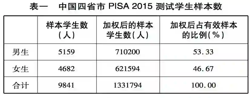 PISA项目分两阶段,按规模大小成比例(Probability Proportionate to Size,简称PPS)概率抽样,以保证每个抽样单元(学校)按其规模大小都有均等的被随机抽选的概率。具体而言,该项目首先依照学校属性选定外显分层变量(如学校地理位置、学校类型、学段等),将学校划分为不同组群,并以学校规模为内隐分层变量,接着采用分层随机抽样方法选取样本学校作为抽样单元,然后运用KeyQuest软件在被抽中的学校随机抽取特定比例和数量的学生样本(OECD,2016a)。2015年,PISA在我国北京、上海、广东和江苏四省市的268所学校随机抽取了9841名学生进行测试,利用抽样学生权重变量(Wfstuwt)加权后的样本学生数为1331794人(见表一)。其中,男生样本数为5159人,加权后的样本男生数为710200人,占总体样本的53.33%;女生样本数为4682人,加权后的样本女生数为621594人,占总体样本的46.67%。从学校地理位置看,城市学校与乡村学校(包含乡镇及农村)的样本学生数分别为3703人和5934人(另有204名学生所在学校地理位置缺失)。
