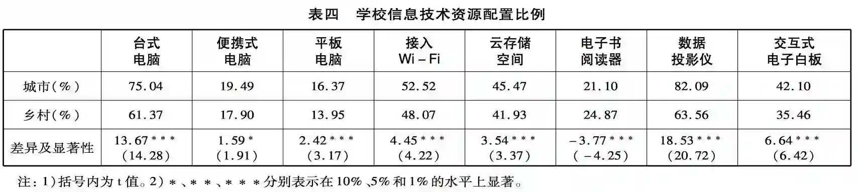 对比城乡间的差异可以发现,我国四省市城市学校与乡村学校为学生学习提供的信息技术资源仍存在较大差距(见表四)。7504%的城市学生反映学校配备了可供学习使用的台式电脑,这一比例在乡村学校平均为61.37%,前者比后者高13.67个百分点(t=14.28)。另有19.49%的城市学生表示学校为学生学习配置了便携式电脑,较乡村学生高1.59个百分点;16.37%的城市学生反映学校配备了可供学生学习的平板电脑,较乡村学生高2.42个百分点;52.52%的城市学生反映在学校可以接入Wi-Fi,而这一比例在乡村学校约为48.07%,两者相差4.45个百分点。除电子书阅读器外,城市学校提供的云存储空间、数据投影仪和交互式电子白板等设备,均显著高于乡村学校。以上数据表明,乡村学校学生可利用的信息技术资源总体明显低于城市学校学生。要改变城乡间学校发展不均衡状况,未来教育政策重点应当加大对乡村学校信息技术资源的倾斜投入,这对于缩小城乡间教育差距具有重要的政策价值和现实意义。