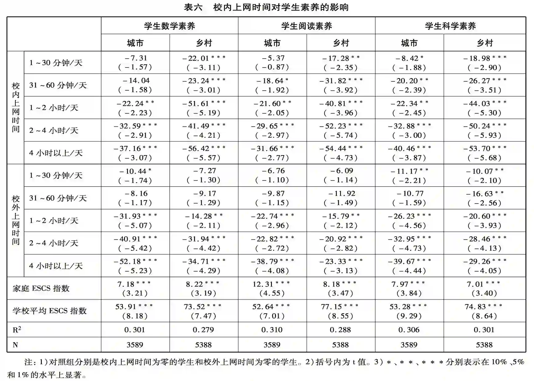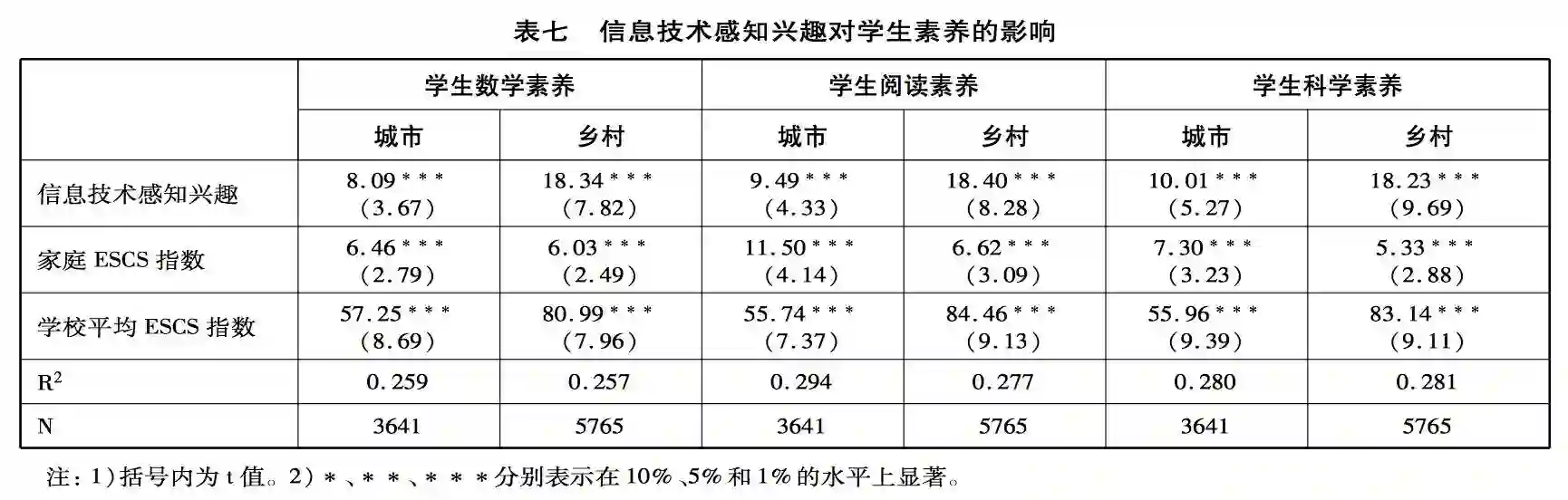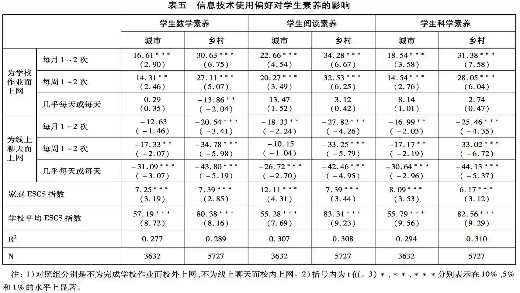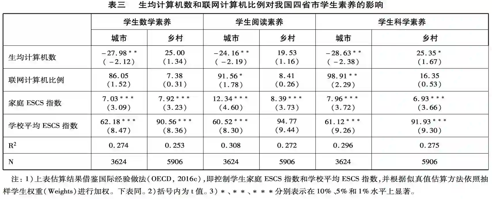 (一)在控制学生家庭背景和学校生源背景的条件下,生均计算机数对乡村学生数学、阅读及科学素养有微弱的正向影响,但对城市学生素养的影响显著为负。