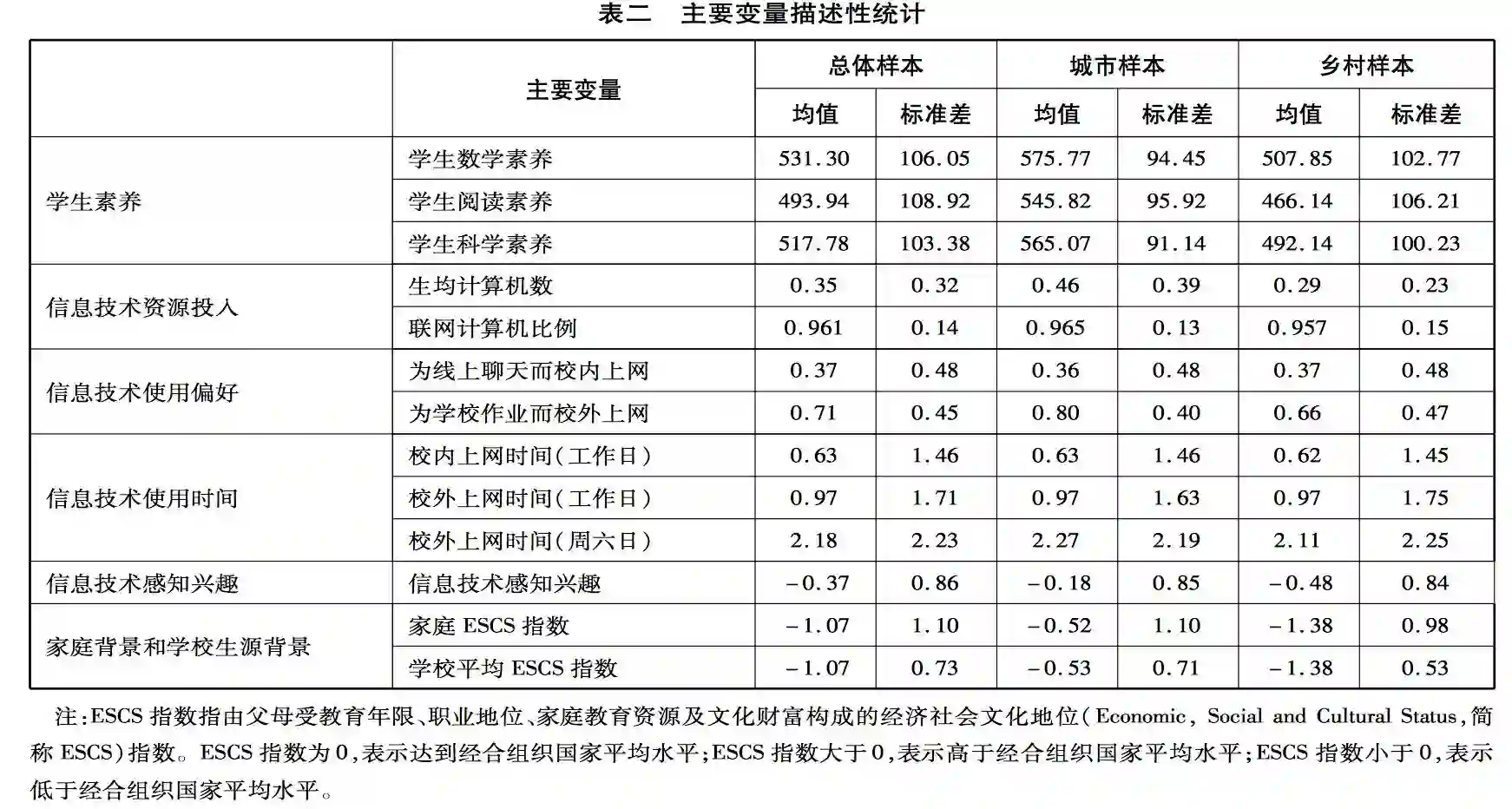 表二为总体样本以及城市与乡村两个子样本相关变量的描述性统计结果。我国四省市学生数学、阅读及科学素养均值分别为531.30分、493.94分和51778分,其中城市与乡村学生的科学素养均值分别为565.07分和492.14分,前者比后者高出近15%。两个子样本在信息技术资源投入、信息技术使用偏好、使用时间、感知兴趣、家庭背景以及学校生源背景等方面存在较明显差异。