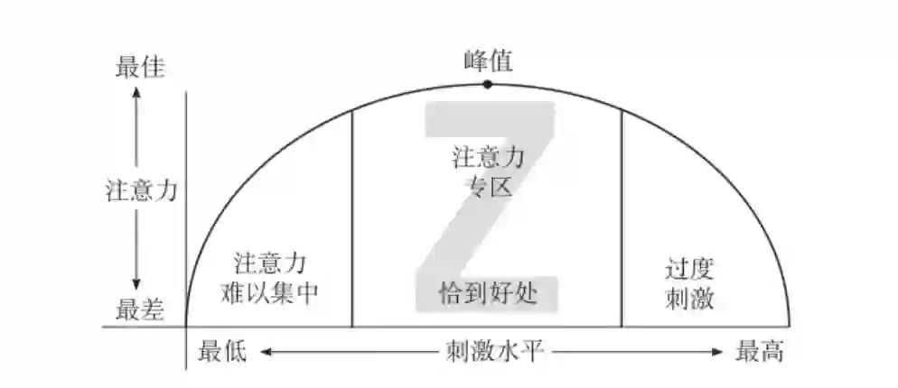 注意力曲线意味着随着刺激水平的升高,注意力水平也会逐步升高,达到峰值之后,就开始逐渐下降;在注意力曲线的中心区,受到的刺激程度恰到好处,这时注意力是处在最佳状态的,工作效率也是最高的,这块中心区域就叫注意力专区。