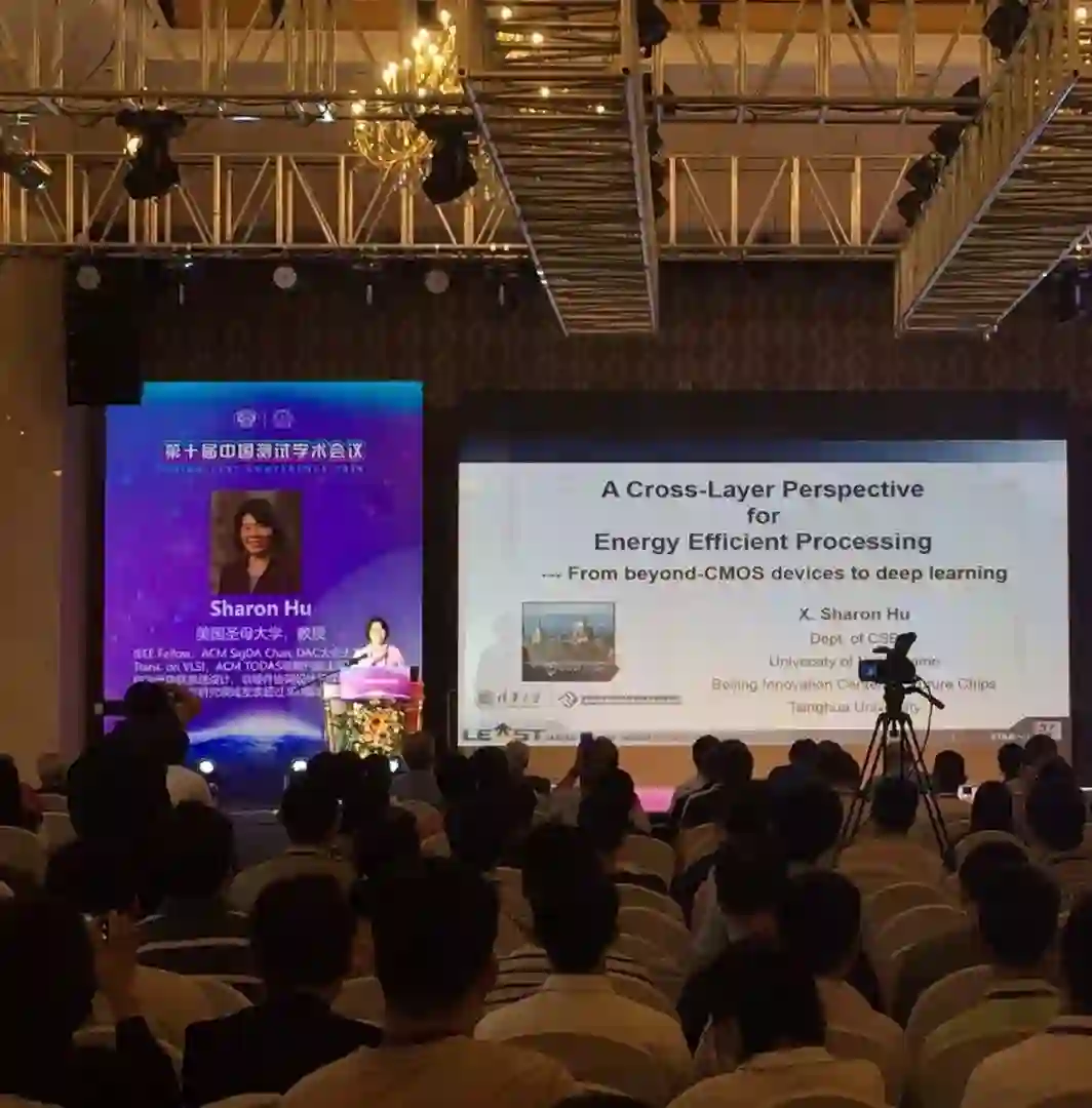 美国圣母大学的 X. Sharon Hu 教授做了题为“A Cross-Layer Perspective for Energy Efficient Processing—from Beyond-CMOS Devices to Deep Learning” 的主题报告。胡教授从跨层设计的 角度,介绍了采用新型器件在非冯诺依曼体系结构的应用。尤其通过探究新型器件独有的行 为特征,辅以新电路,新结构来提升功耗和性能,最终透过对应用程序的评测可以体现跨层 设计的综合收益。